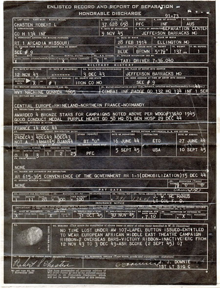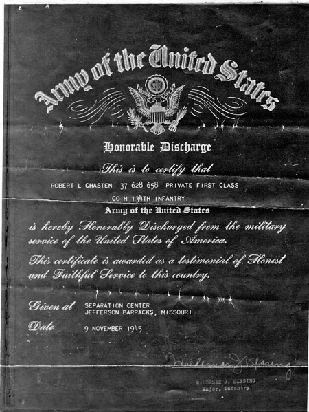 Robert Lee Chasten was born February 28, 1914 in Reynolds, Missouri. He registered for the draft October 16, 1940 when he was 26 years old and living in Arcadia, Missouri. He was inducted in the Army November 12, 1943 and entered active service December 3, 1943 at Jefferson Barracks, Missouri. He arrived in the ETO June 27, 1944, joined the Second Platoon, Company H, 134th Infantry Regiment as a Machine Gunner from the 86th Replacement Battalion on July 21, 1944 when the unit was in the vicinity of St Lo, France and was promoted to Private First Class August 8, 1944. He was wounded by a shell blast December 14, 1944 in the vicinity of Habkirchen, Germany. After recuperating from his wounds, he rejoined his unit April 10, 1945 when they were near Gelsenkirchen, Germany. After the war ended he returned to the U.S. aboard the Queen Mary, sailing from Southhampton, England on September 5, 1945 and arriving in New York Harbor five days later on Monday, September 10, 1945. For his service, Pfc Robert L Chasten was awarded the European African Middle East Campaign Medal with 4 Bronze Campaign Stars, the Combat Infantryman Badge, Purple Heart, and Good Conduct Medal. He was discharged from the Army November 9, 1945 at Jefferson Barracks, Missouri. He passed away February 14, 1981 and is buried at Masonic Cemetery, Ironton, Missouri.