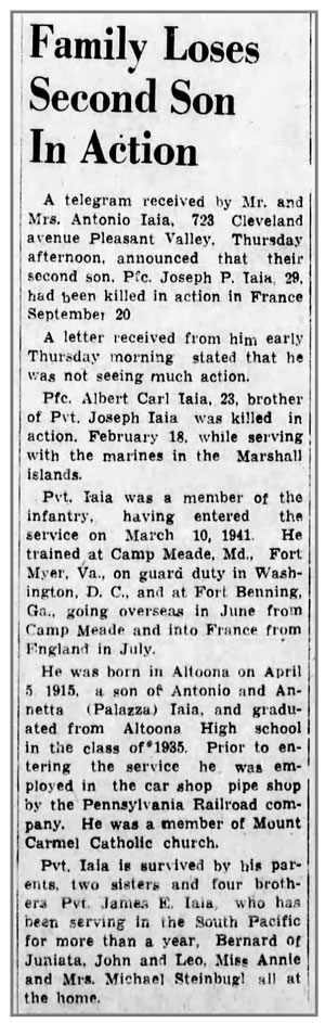 Joseph Paul Iaia, son of Antonio and Annetta (Palazzi) Iaia, was born April 5, 1915 in Altoona, Pennsylvania. He registered for the draft October 16, 1940. At the time he was working at the Pennsylvania Railroad Company. He enlisted in the Army March 10, 1942 at Fort George Meade, Maryland and joined Company K, 134th Infantry Regiment as a Messenger from the 48th Replacement Battalion August 10, 1944. Pfc Joseph P Iaia was killed in action September 20, 1944 at Agincourt, France. He is buried at Calvary Cemetery, Altoona, Pennsylvania.