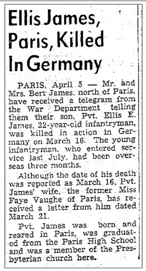 Ellis Eugene James, son of Bert Lester and Thelma Inez (Moore) James was born June 3, 1923 in Paris, Missouri. He married Faye Louise Vangher on March 2, 1944. He registered for the draft June 30, 1942 and was inducted into the Army July 21, 1944 at Jefferson Barracks, Missouri. He joined Company K, 134th Infantry Regiment as a Rifleman from the 38th Replacement Battalion January 17, 1945 when the unit was in Remichampagne, Belgium, about 6 miles southwest of Bastogne. Pfc Ellis E James was wounded in action March 26, 1945 near Dinslaken, Germany and died of his wounds that same day. He is buried at Netherlands American Cemetery, Margraten, Netherlands.