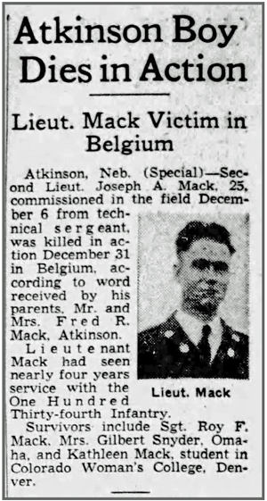Joseph Andrew Mack, son of Fred Roy and Ella (Prussa) Mack, was born August 17, 1919 in Atkinson, Nebraska. He registered for the draft October 16, 1940 and was inducted into the Army February 19, 1941. He was a member of the Anti-Tank Platoon, Headquarters Company 2nd Battalion, 134th Infantry Regiment and landed at Omaha Beach July 6, 1944. He was promoted from Technical Sergeant and commissioned 2nd Lieutenant December 1, 1944. 2nd Lt Joseph A Mack was killed in action December 31, 1944 by machine gun fire in the vicinity of Lutrebois, Belgium. He was awarded a Silver Star Medal for gallantry during the battle in which he died. He is buried at Saint Joseph Cemetery, Atkinson, Nebraska.