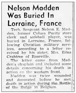 Nelson Elisha Madden, son of William Elisha and Nancy Elizabeth (Shaw) Madden, was born February 13, 1916 in Puxico, Missouri. He registered for the draft October 16, 1940. At the time he was living in Orland Glenn, California. He was inducted into the Army February 10, 1942, served in Company C, 134th Infantry Regiment, and landed at Omaha Beach in Normandy France July 5, 1944. He was promoted to Sergeant July 17 and to Staff Sergeant, Squad Leader August 11, 1944. He was wounded by shrapnel November 14 in the vicinity of Morhange, France and returned to duty with Company C on December 14, 1944 when the unit was in the vicinity of Sarreguemines, France. He was again promoted to Technical Sergeant December 19, 1944. T/Sgt Nelson E Madden was killed in action January 1, 1945 in the vicinity of Lutrebois, south of Bastogne, Belgium. He was originally buried at the Lorraine American Military Cemetery in France and was laid to final rest at Rock Hill Cemetery, Puxico, Missouri.