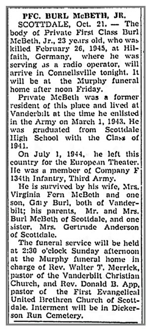 Burl McBeth, Jr, son of Burl and Frances Mildred (Stauffer) McBeth, was born January 27, 1922 in Mt Pleasant, Pennsylvania. He married Virginia Fern Derryberry August 2, 1943 and the couple had a son, Gary Burl. He registered for the draft June 30, 1942. At the time he was living in Scottsdale, Pennsylvania and working at the National Tube Company. He was inducted into the Army February 22, 1943 at Greensburg, Pennsylvania and joined Company H, 134th Infantry Regiment from the 86th Replacement Battalion July 31, 1944 when the unit was in the vicinity of Conde-sur -Vire, France. Pfc Burl McBeth, Jr was killed in action February 26, 1945 when he was struck and killed by fragments from mortar fire while operating a field radio in an observation post while directing fire upon enemy positions in the vicinity of Hilfarth, Germany. According to a notation in his killed in action report, his Captain said "All the men will miss him. He was a wholesome boy - liked by all for his charitable attitude". He is buried at Dickerson Run Union Cemetery, Dickerson Run, Pennsylvania.