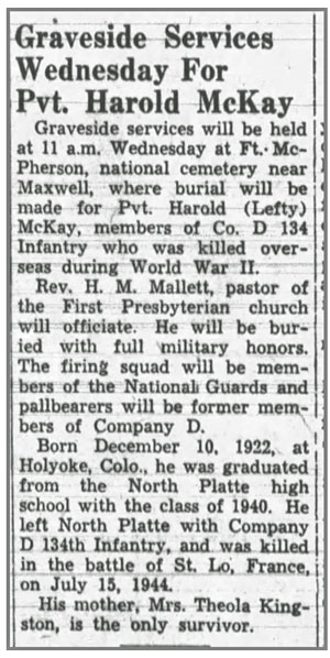 Harold G McKay, son of Theola McKay, was born December 10, 1922 in Holyoke, Colorado and moved to Nebraska sometime prior to 1940. He was a member of the Nebraska National Guard, mobilized to Federal service December 23, 1940 at North Platte, Nebraska, and served as a Heavy Machine Gunner in the Second Platoon, Company D, 134th Infantry Regiment. Pvt Harold G McKay was killed by a mortar shell blast July 15, 1944 in the vicinity of St Lo, France and was awarded a Silver Star Medal for gallantry during the battle in which he died. He is buried at Fort McPherson National Cemetery, Maxwell, Nebraska.