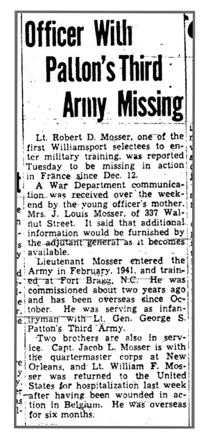 Robert Dugan Mosser, son of Jacob Louis and Mary Margaret (Dugan) Mosser, was born January 31, 1916 in Williamsport, Pennsylvania. He married Mildred Ann Kreuzberger February 2, 1942 in Chicago, Illinois. He registered for the draft October 16, 1940. At the time he was living in Saginaw, Michigan and working at F W Woolworth. He was inducted into the Army February 14, 1941 at Saginaw, Michigan and was commissioned 2nd Lieutenant October 16, 1942. He departed for the ETO in October 1944 and joined Company K, 134th Infantry Regiment as a Platoon Leader from the 38th Replacement Battalion November 16, 1944 while the unit was in the vicinity of Morhange, France. 2nd Lt Robert D Mosser was reported missing December 12, 1944 in the vicinity of Bliesbruck, France and was later confirmed killed in action December 20, 1944. He is buried at Lorraine American Cemetery, Saint Avold, France.
