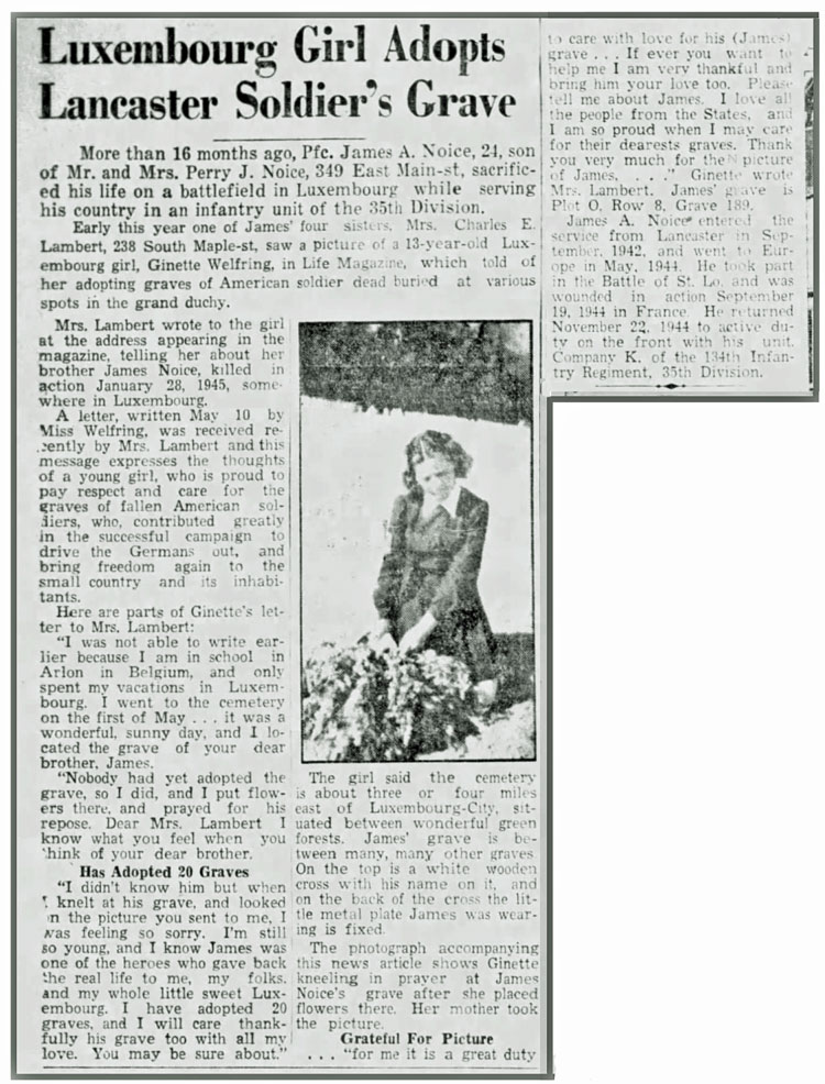 James Aloysius Noice, son of Perry Joseph and Rose Frances (Evans) Noice, was born October 9, 1920 in Lancaster, Ohio. He was inducted into the Army September 25, 1942 and joined Company K, 134th Infantry Regiment July 17, 1944 from the 86th Replacement Battalion when the unit was in the vicinity of St Lo, France. He was wounded by shrapnel September 22, 1944 in the vicinity of Agincourt, France and returned to duty December 31, 1944. Pfc James A Noice was killed in action January 28, 1945 by concussion from an artillery/mortar blast in the vicinity of Heinerscheid, Luxembourg. He was originally interred at Luxembourg American Cemetery and was laid to final rest in 1948 at Saint Mary Catholic Cemetery, Lancaster, Ohio.