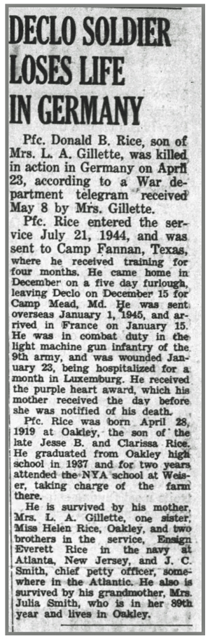 Donald Blaine Rice, son of Jesse Blaine and Clarissa Caroline (Smith) Rice, was born April 27, 1945 in Oakley, Idaho. He registered for the draft October 16, 1940. At the time he was living in Burley, Idaho and working at Amalgamated Sugar Factory in Burley. He was inducted into the Army July 19, 1944 in Butte, Montana and joined Company K, 134th Infantry Regiment January 18, 1945 from the 48th Replacement Battalion. He was wounded in action by shell fragments in the vicinity of Basbellain, Luxembourg on January 23 and returned to duty February 23, 1945. He was promoted to Private First Class March 4, 1945. Pfc Donald B Rice was killed in action April 23, 1945 by small arms fire at Kehnert, Germany northeast of Magdeburg along the Elbe River during a German counter-attack on the town. He is buried at Netherlands American Cemetery, Margraten, Netherlands.