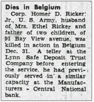 Homer Dean Ricker Jr, son of Homer Dean and Elsie Margaret (Drysdale) Ricker, was born April 29, 1913 in Lynn, Massachusetts. He married Ethel Lillian Markland in 1935 and the couple had 2 children, a daughter Shirley Elizabeth and a son John. He registered for the draft October 16, 1940. At the time he was working at Manufactures Central National Bank in Lynn, Massachusetts. He joined Company H, 134th Infantry Regiment from the 38th Replacement Battalion as a Machine Gunner on September 20, 1944. The following week, on September 29, 1944, he participated in the rescue of 81 children trapped in a chateau behind enemy lines at Han, France. An article about the rescue known as the "Baby Patrol" appeared in Time Magazine, October 30, 1944. He was promoted to Corporal December 24, 1944. Corporal Homer D Ricker was wounded by artillery shell fragments in the vicinity of Lutrebois, Luxembourg and died of his wounds that same day. He is buried at Henri-Chapelle American Cemetery, Henri-Chapelle, Belgium.