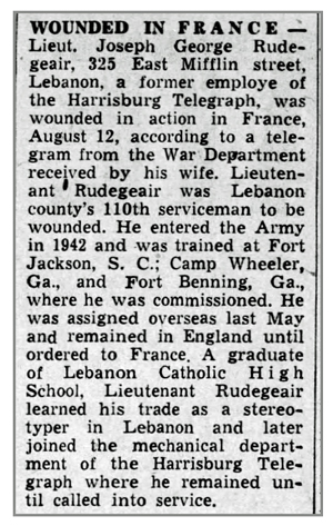 Joseph George Rudegeair, son of Raymond Nicholas and Anna Mabel (Redinger) Rudegeair, was born March 25, 1913 in Lebanon, Pennsylvania. He married Rose A. Miller February 14, 1942. He was inducted into the Army in April 1942, graduated from Officer's Candidate School January 1, 1943 and was commissioned as a 2nd Lieutenant. He trained at Fort Jackson, South Carolina, Camp Wheeler and Fort Benning, Georgia and was commission 1st Lieutenant July 22, 1943. He departed for the ETO in May 1944 and joined Company C, 134th Infantry Regiment as a Platoon Leader from the 48th Replacement Battalion August 10, 1944. He was wounded in action by artillery shell fragments 2 days later August 12, 1944 in the vicinity of Mortain, France. He returned to duty September 2 and transferred to Company M September 3, 1944. 1st Lt Joseph G Rudegeair was killed in action November 17, 1944 in the vicinity of Morhange, France. He is buried at Lorraine American Cemetery, Saint-Avold, France.