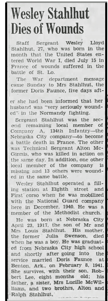Wesley Lloyd Stahlhut, son of Louis and Julia (Swenson) Stahlhut, was born April 23, 1917 in Nebraska City, Nebraska. He graduated from Nebraska City High School in 1935 and operated the Phillips 66 Gas Station at 8th and First Corso in Nebraska City prior to the war. He was a member of the Nebraska National Guard and was inducted into Federal Service December 23, 1940. He married Doris Faunce on February 8, 1941 at Benton, Arkansas while he was stationed at Camp Robinson. The couple had one child, a son, Roger Lee Stahlhut. S/Sgt Wesley L Stahlhut served as a Section Leader in the Weapons Platoon, Company A, 134th Infantry Regiment, 35th Infantry Division. He was seriously wounded in action July 15, 1944 during the battle for St Lo, France and died of his wounds that same day. He is buried at Wyuka Cemetery in Nebraska City, Nebraska.