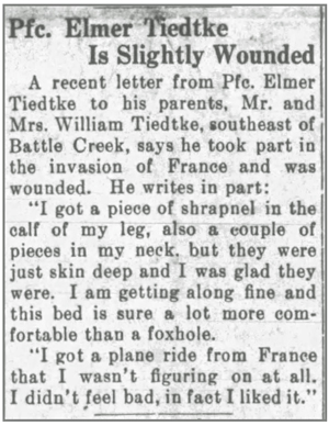 Elmer Leo Tiedtke, son of William Fred and Emelia "Emma" (Pleksnies) Tiedtke, was born March 5, 1916 in Madison County, Nebraska. He was an Automatic Rifleman in the Third Platoon, Company L, 134th Infantry Regiment. He was wounded in action July 18, 1944 during the battle for St Lo, France and returned to duty October 7, 1944. Pfc Elmer L Tiedtke was killed in action November 17, 1944 in the vicinity of Morhange, France. He is buried at Lorraine American Cemetery, Saint-Avold, France.