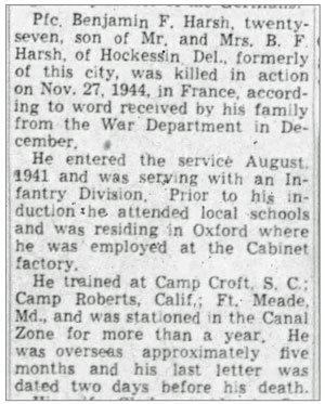Benjamin Franklin Harsh, Jr, son of Benjamin Franklin, Sr and Mary Ann (Kreider) Harsh, was born May 27, 1917 in Valley Forge, Pennsylvania. He registered for the draft October 16, 1940 and enlisted in the Army August 25, 1941 at New Cumberland, Pennsylvania. He joined Company B, 137th Infantry Regiment as a Rifleman from the 86th Replacement Battalion July 21, 1944 when the unit was in the vicinity of St Lo, France and was awarded the Combat Infantryman Badge August 1, 1944. Pfc Benjamin F Harsh, Jr was killed in action November 19, 1944 in the vicinity of Bertring, France. He is buried at Lorraine American Cemetery, Saint Avold, France.