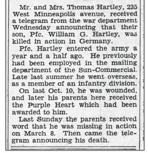 Bill Gene Hartley, son of Thomas Loren and Leona Marie (McMurray) Hartley, was born July 1, 1925 in Vincennes, Indiana. He registered for the draft when he was 18 years old on July 1, 1943 and enlisted in the Army September 23, 1943 at Evansville, Indiana. He joined Company L, 137th Infantry Regiment as a Rifleman from the 38th Replacement Battalion September 23, 1944 when the unit was at Champenoux, France. He was wounded in action by a shell blast October 10, 1944 near Fossieux, France and returned to duty January 5, 1945 when the unit was at Livarchamps, Belgium, about 7 miles north of Bastogne. He was promoted to Private First Class February 3, 1945. Pfc Bill G Hartley was initially reported missing and later confirmed killed in action March 8, 1945 in the vicinity of Ossenberg, Germany. He is buried at Netherlands American Cemetery, Margraten, Netherlands.