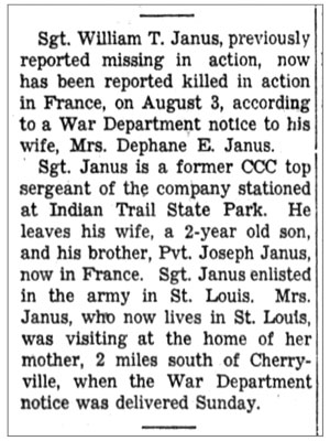 William Thomas Janus, son of Michael and Josephine (Gruber) Janus, was born March 3, 1913 in St Louis, Missouri. He married Daphane Elizabeth Jones on November 29, 1941 and the couple had a son, William. He registered for the draft October 16, 1940. At the time he was working for the Civilian Conservation Corps. He was inducted into the Army January 19, 1942 and served in Headquarters Company 2nd Battalion, 137th Infantry Regiment. He was awarded the Combat Infantryman Badge August 1, 1944. Sgt William T Janus was initially reported missing and was later confirmed killed in action August 3, 1944 in the vicinity of La Fortière, south of St Lo, France. He is buried at Freeman Cemetery, Cherryville, Missouri.