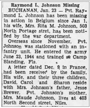 Raymond Lawrence Johnson, son of Richard Lester and Maude (Truelove) Johnson, was born on June 2, 1921, in Indiana. He married Rieta May Brewer on November 4, 1939, and together they had three children: David Lester, Carol Ann, and Sharon Lee. He registered for the draft on February 15, 1942, at the age of 20, while living in Niles, Michigan, and working at the Kawneer Company, a manufacturing plant in Niles. He was inducted into the U.S. Army on June 23, 1944. After training at Camp Blanding, Florida, he was deployed to the European Theater of Operations (ETO) in November 1944. On December 21, 1944, he joined Company K, 137th Infantry Regiment as a rifleman from the 14th Replacement Battalion, while the unit was near Sarreguemines, France. For his service, he was awarded the Combat Infantryman Badge on January 1, 1945. Pvt Raymond L Johnson was initially reported missing and was later confirmed to have been killed in action on January 5, 1945, near Villers-la-Bonne-Eau, approximately six miles south of Bastogne, Belgium. He is buried at Luxembourg American Cemetery in Hamm, Luxembourg.