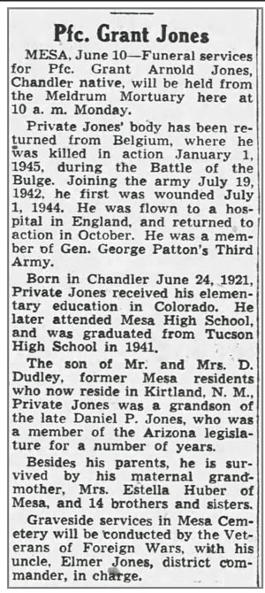 Grant Arnold Jones, son of Daniel Dudley and Daisy Eleanor (Huber) Jones, was born June 24, 1921 in Goodyear, Arizona and moved to Colorado in November 1927. He registered for the draft February 14, 1942 when he was 20 years old and working on his father's farm in Kline, Colorado. He was inducted into the Army August 25, 1942 at Pueblo, Colorado. He was an Ammunition Handler in Company A, 137th Infantry Regiment, landed at Omaha Beach, Normandy France July 7, 1944 and was promoted to Private First Class July 24, 1944. He was awarded the Combat Infantryman Badge August 1, 1944. He was wounded by artillery shell blast fragments in the vicinity of Orleans, France on August 17 and returned to duty November 15, 1944 when the unit was at Marthille, France. Pfc Grant A Jones was initially reported missing January 1, 1945 in the vicinity of Livarchamps, Belgium and later confirmed killed in action on that date. He is buried at City of Mesa Cemetery, Mesa, Arizona.