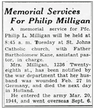 Philip Lueroy Milligan, son of Lue Roy and Rose Anne (Lannan) Milligan, was born February 3, 1912 in Hiteman, Iowa. He married Nadine Virginia Bridges June 3, 1939 and the couple had a son, Gary Lou. He registered for the draft October 16, 1940. At the time he was living in Des Moines, Iowa and was inducted into the Army March 20, 1944 at Camp Dodge Herrold, Iowa. He joined Company E, 137th Infantry Regiment as a Rifleman from the 71st Replacement Battalion October 3, 1944 while the unit was in the vicinity of Grémecey, France. He was awarded the Combat Infantryman Badge November 1 and was promoted to Private First Class November 20, 1944. Pfc Philip L Milligan was seriously wounded in action by shell fragments February 27 in the vicinity of Gladbach, Germany, transferred to the 105th Evacuation Hospital, and died of his wounds the following day, February 28, 1945. He is buried at Netherlands American Cemetery, Margraten, Netherlands.