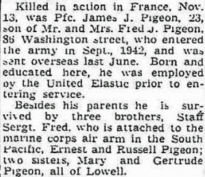 James Thomas Pigeon, son of Frederick Joseph and Mary Elizabeth (Angelo) Pigeon, was born June 23, 1921 in Lowell Massachusetts. He registered for the draft February 16, 1942. At the time he was working at United Elastic Corporation in Lowell. He was inducted into the Army September 14, 1942 at Fort Devens, Massachusetts. He joined Company B, 137th Infantry Regiment as a Rifleman from the 38th Replacement Battalion September 16, 1944 and was awarded the Combat Infantryman Badge October 1, 1944. Pfc James T Pigeon was killed in action November 13, 1944 by an artillery blast just west of Morhange, France. He is buried at Lorraine American Cemetery, Saint-Avold, France.