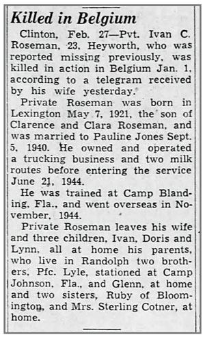 Ivan Clarence Roseman, son of Clarence and Clara (Leach) Roseman, was born May 7, 1921 in Lexington, Illinois. He married Pauline Jones September 5, 1940 and the couple had three children, Ivan, Doris, and Lynn. He registered for the draft February 2, 1942. At the time he was living in Randolph, Illinois where he owned and operated a trucking company. He entered service June 21, 1944, joined Company C, 137th Infantry Regiment from the 14th Replacement Battalion December 21, 1944 as a Rifleman, and was awarded the Combat Infantryman Badge January 1, 1945. Pvt Ivan C Roseman was originally reported missing and was later confirmed killed in action January 1, 1945 during the Battle of the Bulge in the vicinity of Villers-la-Bonne-Eau, Belgium. He is buried at East Lawn Memorial Gardens Cemetery, Bloomington, Illinois.
