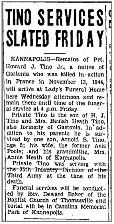 Howard Jessie Tino Jr, son of Jessie Howard and Beulah Mary (Heath) Tino, was born August 4, 1925 in Gastonia, North Carolina. He married Avis Katherine Poole and the couple had a son, Arnold Bernard Tino. He registered for the draft August 4, 1943. At the time he was living in Kannapolis, North Carolina and working at Cannon Textile Mill. He was inducted into the Army December 9, 1943 at Camp Croft, South Carolina and joined Company B, 137th Infantry Regiment from the 38th Replacement Battalion October 11, 1944 and served as a Rifleman. Pvt Howard J Tino, Jr was killed in action November 13, 1944 in the vicinity of Achain, France. He is buried at Carolina Memorial Park, Concord, North Carolina.