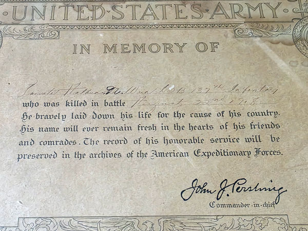 Arthur Norton Weir, son of Mahlon and Clara (Bond) Weir, was born October 16, 1896 in Mount Pleasant, Iowa and moved with his family to Horton, Kansas when he was 3 years old. He enlisted in the Kansas National Guard, Company B, 137th Infantry Regiment at Horton and served on the Mexican border in 1916. He departed for France aboard the SS Karmala, departing from New York April 25, 1918. Pvt Arthur N Weir was killed by gunfire from a concealed enemy machine gun nest while gathering wood near his camp in the Vosges Mountains in France on August 23, 1918. He is buried at Horton Cemetery, Horton, Kansas.