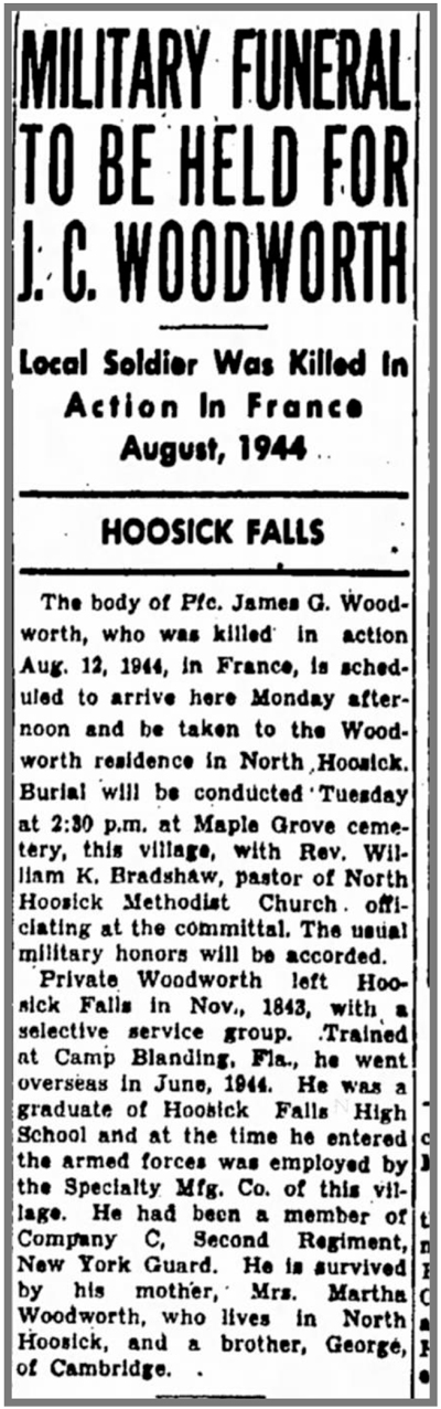 James Gilbert Woodworth, son of James and Martha (Ward) Woodworth, was born November 16, 1920 in North Hoosick, New York. He registered for the draft February 15, 1942 and was inducted into the Army October 12, 1943 at Albany, New York. He joined Company B, 137th Infantry Regiment from the 86th Replacement Battalion on July 19, 1944 and served as a Rifleman. He was originally reported missing August 12, 1944 in the vicinity of Mortain, France. It was later confirmed that he had been killed in action that same date. Pvt James G Woodworth is buried at Maple Grove New Cemetery, Hoosick Falls, New York.