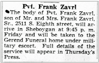 Frank William Zavrl, Jr, son of Frank William and Anna (Paskvalis) Zavrl, was born March 12, 1914 in Sheboygan, Wisconsin. He graduated from the Saints Cyril and Methodius parochial school and Sheboygan Vocational School. A Chicago and Northwestern Railroad employment record for Sheboygan shows him working as a Section Laborer as of July 8, 1937. He married Irene Thierman on November 18, 1938 in Dubuque, Iowa. The marriage record lists his place of residence as Drummond, Wisconsin and his occupation as farming. He registered for the draft October 16, 1940. At that time he was living in Plymouth, Wisconsin. He was employed by Kraft Cheese in Plymouth when he was inducted into the Army June 26, 1943. According to his obituary, after entering service, he received anti-aircraft training at Fort Sheridan, Illinois and Camp Hulen, Texas, and following his transfer to the Infantry, he was stationed in Arkansas and Fort Meade, Maryland.