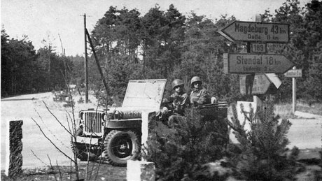 137th Infantrymen before a German bus taken near Stendal, Germany
