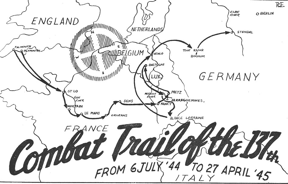 The map shows the footsteps taken by the 137th Infantry from Omaha Beach to the Elbe River.