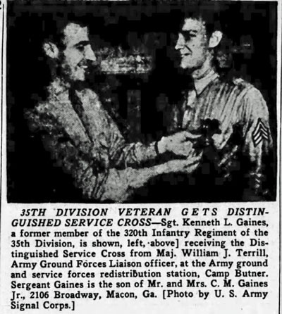 Kenneth Lamar Gaines was born June 18, 1925 in Macon, Georgia. He registered for the draft on his 18th birthday, June 18, 1943, and was inducted into the Army August 25, 1943. He joined Company B, 320th Infantry Regiment as a Rifleman from the 41st Replacement Battalion July 13, 1944 when the unit was in the vicinity of St Lo, France. He was wounded in action by shell fragments southeast of St Lo July 28, 1944 and returned to duty January 12, 1945 when the unit was in the vicinity of Lutrebois, Belgium. He was promoted to Sergeant February 7, 1945 and was awarded a Bronze Star Medal, Silver Star Medal, and the Distinguished Service Cross for heroic action in March and April 1945. He was assigned to Fort McPherson, Georgia for rest and recreation on May 6 and discharged from the Army September 27, 1945.