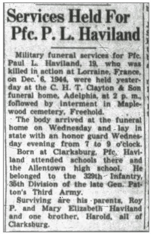 Paul Leslie Haviland, son of Roy Paul and Mary Elizabeth (Brown) Haviland, was born in Clarksburg, New Jersey. His draft registration lists his birth date as July 12, 1925 however his headstone shows July 13, 1925. He registered for the draft July 12, 1943 when he was 18 years old and working at Hightstown Rug Company in Hightstown New Jersey and was inducted into the Army November 26, 1943 at Camden, New Jersey. He joined Company G, 320th Infantry Regiment as a Rifleman from the 38th Replacement Battalion September 22, 1944 when the unit was at Arracourt, France and was promoted to Private First Class December 1, 1944. Pfc Paul L Haviland was killed in action by a shell blast December 6, 1944 in the vicinity of Zetting, France. He is buried at Maplewood Cemetery, Freehold Township, New Jersey.