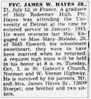 James William Hayes Jr, son of James William Sr and Elizabeth (Devereaux) Hayes, was born March 24, 1923 in Detroit, Michigan. He registered for the draft June 30, 1942 and enlisted in the Army January 28, 1943. He served in Company C, 320th Infantry Regiment and landed at Omaha Beach, Normandy France July 6, 1944. Pfc James W Hayes was killed by a shell blast July 12, 1944 in the vicinity of Saint-Gilles, just west of St Lo, France. He is buried at Mount Olivet Cemetery, Detroit, Michigan.