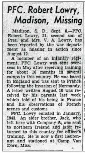 Robert Charles Lowry, son of Vayne Arnold and Daisy Viola (Easterday) Lowry, was born February 6, 1923 in Madison, South Dakota. He registered for the draft June 30, 1942 while working in the Civilian Conservation Corps at Hill City, South Dakota. He was inducted into the Army January 23, 1943 and served in Company D, 320th Infantry Regiment. Pfc Robert C Lowry was initially reported missing August 12, 1944 in the vicinity of Mortain, France and was later confirmed killed in action on that date. He was posthumously awarded the Combat Infantryman Badge August 20, 1944. He is buried at Brittany American Cemetery, Saint James, France.