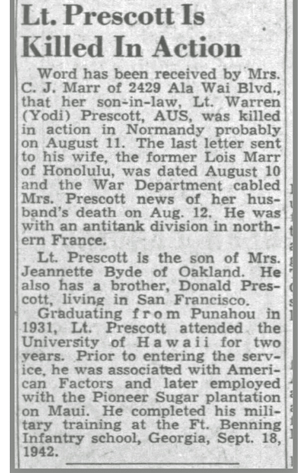 Warren Frederick Prescott, son of Augustus Sherry and Jeannette Gray (Ferguson) Prescott, was born April 8, 1912 in Honolulu, Hawaii. He married Lois Marr January 16, 1937. He registered for the draft November 20, 1940. At the time he was living in Lahaina, Maui, Hawaii and working at the Lahaina Store. He was inducted into the Army December 5, 1942 in Hawaii and served as a Platoon Leader in the Anti-Tank Company, 320th Infantry Regiment. 2nd Lt Warren F Prescott was killed in action August 12, 1944 in the vicinity of Mortain, France. He was awarded a Bronze Star Medal for heroic action in the vicinity of St Lo, France on July 26, 1944 and a Silver Star Medal for gallantry in the battle during which he died. He is buried at Brittany American Cemetery, Saint James, France.