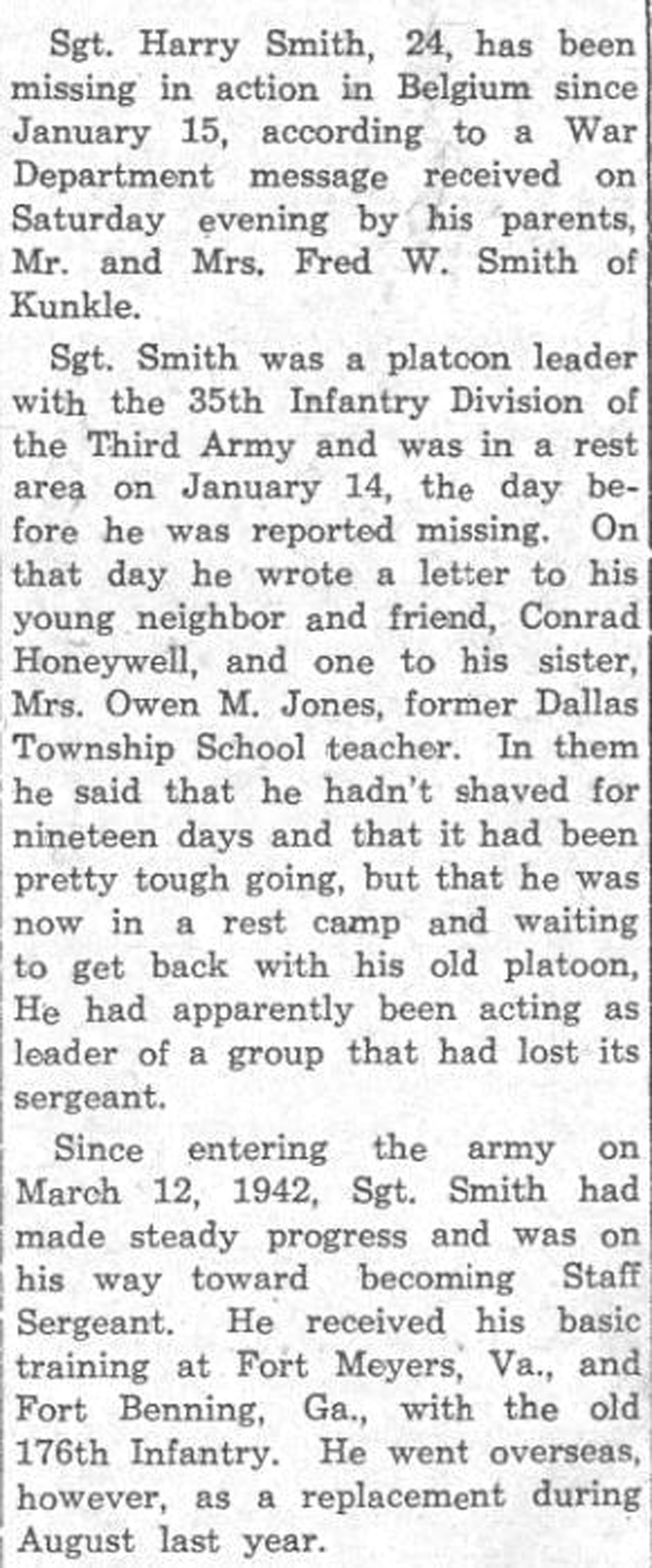 Harry S Smith was born April 20, 1920 in Kunkle, Pennsylvania. He was inducted into the Army March 12, 1942 at Fort George G Meade, Maryland. He joined Company B, 320th Infantry Regiment from the 48th Replacement Battalion August 21, 1944 and was promoted to Sergeant, Squad Leader, December 1, 1944. Originally reported missing, it was later confirmed that he was killed in action January 15, 1945. Sgt Harry S Smith is buried at Henri-Chapelle American Cemetery, Henri-Chapelle, Belgium.