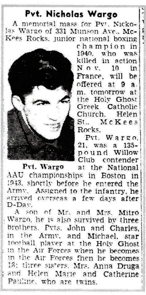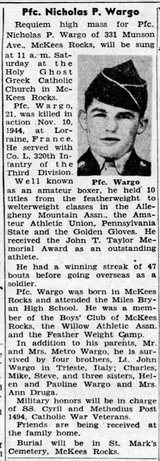 Nicholas Peter Wargo, son of Metro and Pauline (Rosko) Wargo, was born August 20, 1923 in McKees Rocks, Pennsylvania. He registered for the draft June 30, 1942. At the time he was employed by Carnegie Steel. He was inducted into the Army May 5, 1943 at Pittsburgh, Pennsylvania and departed for the ETO in June 1944. He joined Company L, 320th Infantry Regiment from the 38th Replacement Battalion on September 18, 1944. On November 8 he was seriously wounded in action by artillery shell shrapnel in the vicinity of Foret de Chateau-Salins, northeast of Nancy, France. He died of his wounds 2 days later on November 10, 1944. Pfc Nicholas P Wargo is buried at Saint Marks Cemetery, Kennedy Township, Pennsylvania.