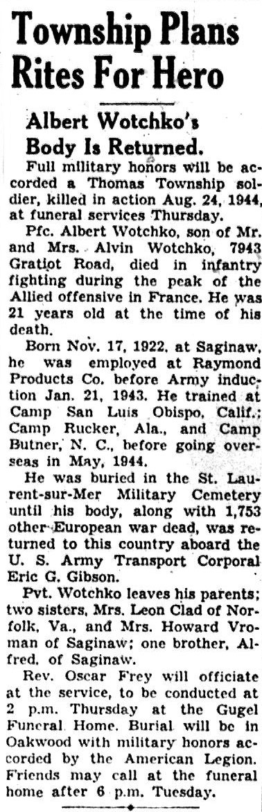 Albert Wotchko, son of Alvin and Alma (Wolff) Wotchko, was born November 17, 1922 in Saginaw, Michigan. He registered for the draft June 30, 1942 and entered service January 21, 1943. He arrived in the ETO in May 1944, billeted in Cornwall, England, and landed on Omaha Beach July 6, 1944. He served as a Messenger in Company E, 320th Infantry Regiment and was awarded the Expert Infantryman Badge July 31, 1944. Pfc Albert Wotchko was killed in action August 2, 1944 in the vicinity of Torigni-sur-Vire, south of St Lo, France. He is buried at Oakwood Cemetery, Saginaw, Michigan.