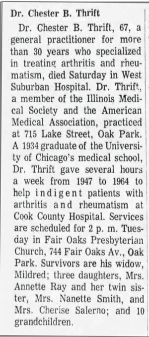 Doctor Chester Bird Thrift, son of Burr Atwell and Ethel Lucille (Bird) Thrift, was born February 9, 1907 in Chicago, Illinois. He enlisted in the Army Medical Corps January 10, 1941. He served in the Medical Detachment, 35th Infantry Division Artillery, and landed at Omaha Beach, Normandy France on July 7, 1944. He was relieved of assignment and transferred to the 194th General Hospital on January 7, 1945 at the rank of Major. By the time of his discharge, December 25, 1945, he had been promoted to the rank of Lt Colonel. Dr. Chester Bird Thrift died January 18, 1975 in Chicago, Illinois. He is buried at Chapel Hill Gardens West, Oakbrook Terrace, Illinois.