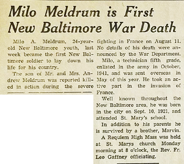 Milo Andrew Meldrum, son of Andrew and Elizabeth Meldrum, was born January 16, 1920 in Detroit, Michigan. He registered for the draft July 1, 1941 when he was 21 years old, living in New Baltimore, Michigan and working as a gas station attendant. He was inducted into the Army November 25, 1941 at Fort Custer, Michigan. He was a truck driver in the 35th Reconnaissance Troop and landed at Omaha Beach, Normandy France July 7, 1944. T/5 Milo A Meldrum was killed in action August 11, 1944 in the vicinity of Mortain, France. He is buried at Brittany American Cemetery, Saint James, France.