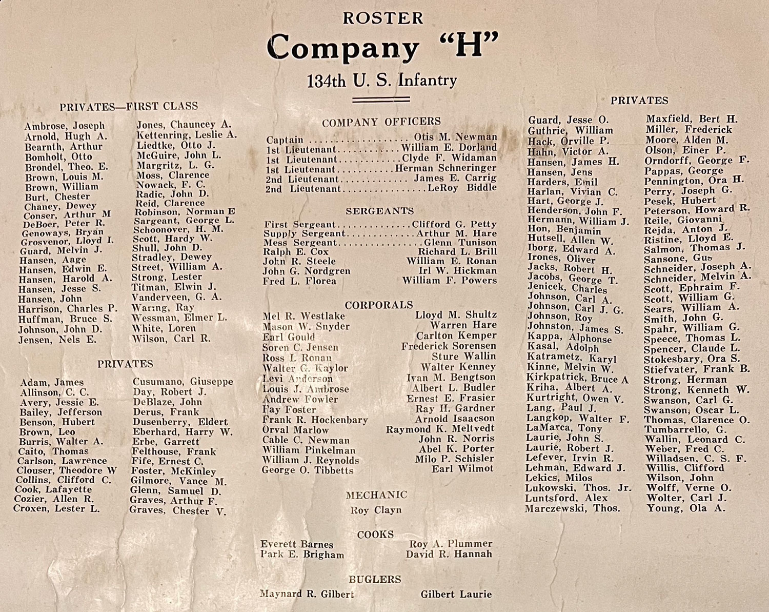 The regiment was mobilized at Camp Cody, New Mexico on July 15,1917, where it was redesignated the 134th Infantry Regiment, 34th Division. After having been called on heavily for cadres and replacements, the Regiment embarked for France October 13, 1918, arriving there October 28. It was never committed in action during World War I.