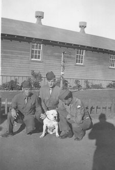 December 1942. This is Sgt Kuder, myself (John Baardsgaard) and Cpl Pister and the battery mascot Butch |