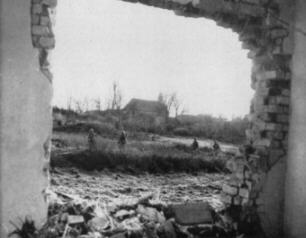 Briefly, the combined infantry-armored attacks were only partially successful. As the first step toward the objective of Puttelange, infantrymen of the 3rd Battalion cleaned out groups of enemy from intervening woods on 24 November, but a deep anti-tank ditch running across the military crest of the ridge as it sloped toward the narrow Maderbach River necessitated bridging operations that night before tanks could enter the next day. That done, the tanks jumped off, but the odds were against them. They had to stay on the road to cross the anti-tank ditch, and as they did so, they came under the effective fire of a long-barreled German tank gun which was firing from a Puttelange cemetery; then, if they deployed off the road, they bogged down in the deep, sticky mud. With this attack stalled, the 3rd Battalions Companies I and K turned to the right and moved down to seize Remering. There they met men of the 1st Battalion, and divided the occupation of the town. The 1st Battalion had retaken Hilsprich after a hard fight the day before (the 1st Battalion, 137th previously had won and lost that town), and then continued through a thousand yards of woods, and then debouched from the woods to continue to Remering.