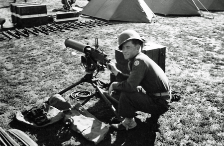 For gallantry in action in the vicinity of Nancy, France, 19 September 1944. During a heavy engagement with the enemy in the vicinity of Nancy on 19 September, an enemy shell burst upon a machine gun emplacement of Company "D", 134th Infantry, killing its crew and breaking the gun's tripod. Sergeant Hansen, a platoon sergeant, seized the gun in his arms, wrapped the belts of ammunition about this shoulders, and advanced, firing the machine gun as he walked toward the enemy. This action enabled the men of his organization to advance to terrain more advantageous cover. Sergeant Hansen then returned, gathered the remaining members of his platoon and, in the face of heavy enemy artillery fire, reorganized them and set up his platoon in positions affording maximum fire in support of the riflemen. He then crawled forward to retrieve a tripod from a wrecked machine gun, thereby enabling an additional machine gun to be put into action. While engaged in directing his platoon in support of the riflemen, Sergeant Hansen was wounded. The courage and daring of Sergeant Hansen, his initiative, resourcefulness, dynamic leadership and disregard for personal safety constitute such gallantry in action as to be in accordance with the traditions of the military service. Entered military service from Nebraska.