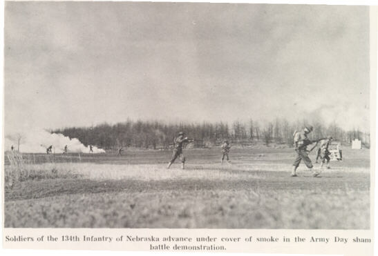 Soldiers of the 134th Infantry of Nebraska advance under cover of smoke in the Army Day sham battle demonstration