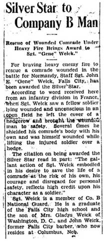Silver Star to Company B Man For braving heavy enemy fire to rescue a comrade wounded in the battle for Normandy, Staff Sgt. John E. "Gene" Weick, Falls City, has been awarded the Silver Star. According to word received here from an infantry division in France, when Sgt. Weick saw a fellow soldier lying wounded and unconscious in an open field he left the cover of a hedgerow and brought the wounded man to safety. Several times he shielded his comrade's body with his own and was himself wounded while lifting the injured soldier over a hedge. The citation on being awarded the Silver Star read in part: "The gallant action of Sgt. Weick embodied in his desire to save the life of a comrade at the risk of his own, his courage and disregard for personal safety, reflects high credit upon his character as a soldier." Sgt. Weick is a member of Co. B National Guard. He is a graduate of Falls City high school and the son of Mrs. Gladys Weick of Washington, D.C., and John Weick, former Falls City barber, who now resides in Columbus, Neb. |