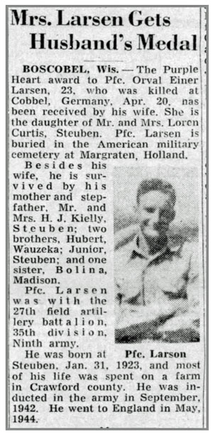 Orval Einer Larsen, son of Niels Emil and Ruby Gladys (Reynolds) Larsen, was born January 31, 1922 in Steuben, Wisconsin. He married Edna Marie Curtis November 5, 1943. He registered for the draft June 30, 1942 and was inducted into the Army September 8, 1942 at Milwaukee, Wisconsin. He was a Light Truck Driver in Headquarters Battery, 127th Field Artillery Battalion. Pfc Orval E Larsen was killed in action April 20, 1945 in the vicinity of Cobbel, Germany. He is buried at Pleasant Mound Cemetery, Easter Rock, Wisconsin.