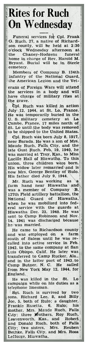 Frank Gust Ruch, son of Gustave Frank and Maudie Opal (Honea) Ruch, was born July 8, 1917 near Barada, Nebraska. He married Lucille Hall and the couple had 2 sons, Richard Lee and Billy Joe, and a daughter Frankie Rosetta. He was a member of the National Guard ordered into Federal Service December 23, 1940 at Hiawatha, Kansas. He served as a Lineman in Battery B, 127 Field Artillery Battalion and landed at Omaha Beach in Normandy France on July 7, 1944. Battery B fired its 1st round against the enemy July 10, 1944. Cpl Frank G Ruch was killed in action by enemy artillery shell fragments July 12, 1944 while policing communication wire. At the time Battery B was just northwest of Saint-Clair-sur-Elle, supporting the 35th Infantry Division in its advance against St Lo, France. Originally buried at the temporary military cemetery at La Cambe, France, he was laid to final rest at Steele Cemetery, Falls City, Nebraska.