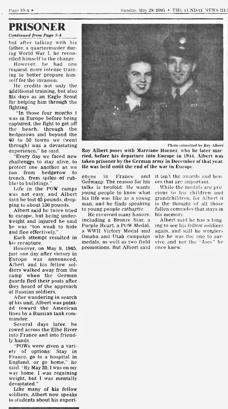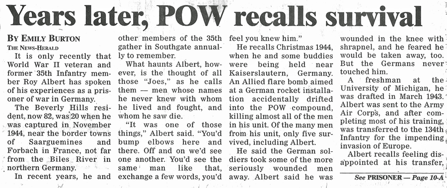 Pfc. Roy I. Albert was reported missing in action as of December 12, 1944. According to the After Action Report, at 5 AM, December 12, they commenced crossing the Blies River, with B and C Companies entering the town of Habkirchen, Germany. They held this bridgehead alone for 48 hours against the repeated counterattacks of over 300 SS troops and tanks.