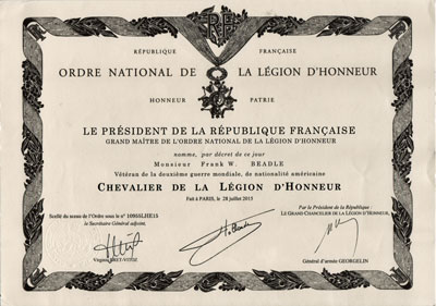 Frank W Beadle Legion of Honor Certificate |