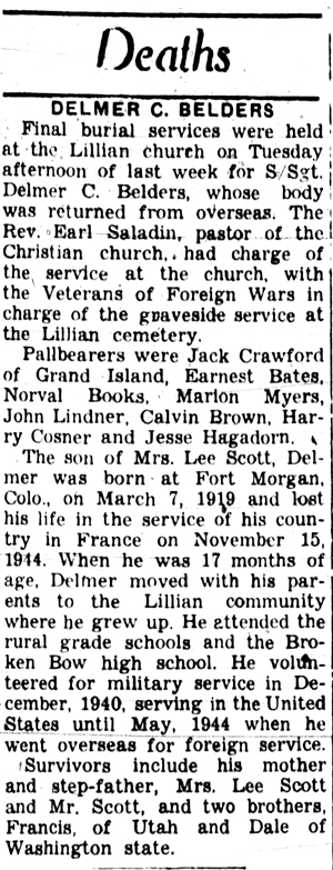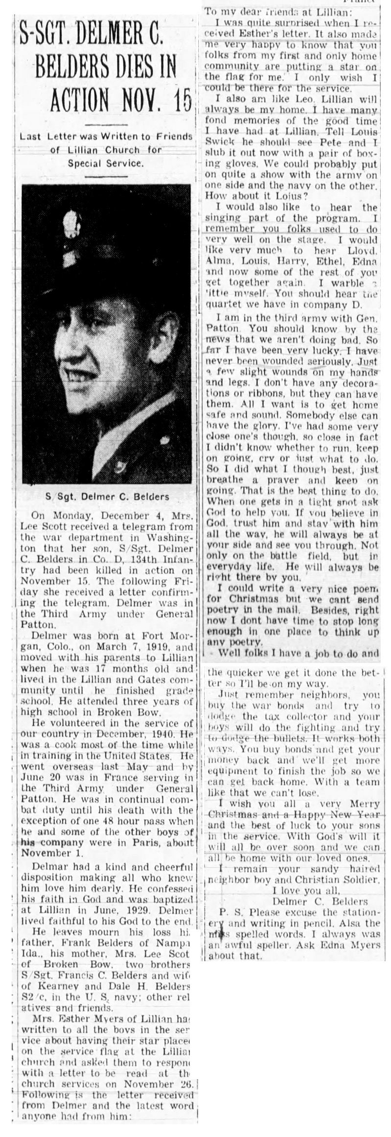 S/Sgt Delmer C Belders was Killed in Action on November 15, 1944 while fighting near Morhange, France. He was posthumously awarded a Bronze Star Medal for his actions during that battle.