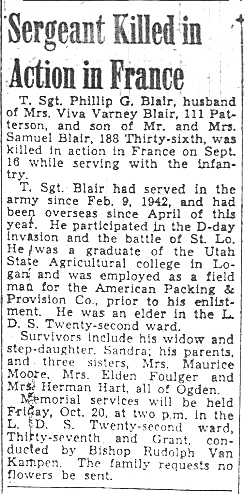 Philip Gee Blair, the son of Samuel and Lois Blair, was born January 1, 1909 in Lewiston, Utah. He was a graduate of Utah State Agricultural College. According to draft registration records, he was 5' 8" tall, weighed 135 pounds, had blue eyes, brown hair, and a light complexion. He was employed as a Field Man at the American Packing and Provision Company in Ogden, Utah. Philip Blair was inducted into the Army on February 9, 1942, at Fort Douglas, Utah. Sometime during 1942 after his enlistment he married Viva Hogan.